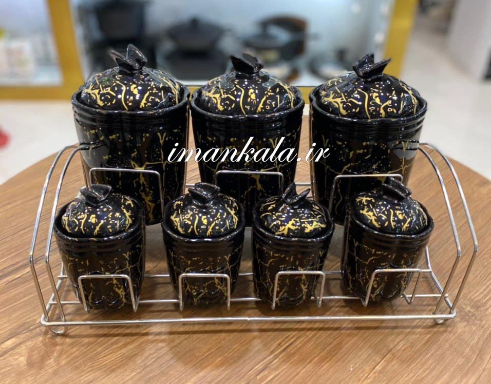 بانکه پاسماوری حبوبات ادویه ۷ پارچه چینی بن چاین درب پروانه استند پایه استیل مرمر مشکی