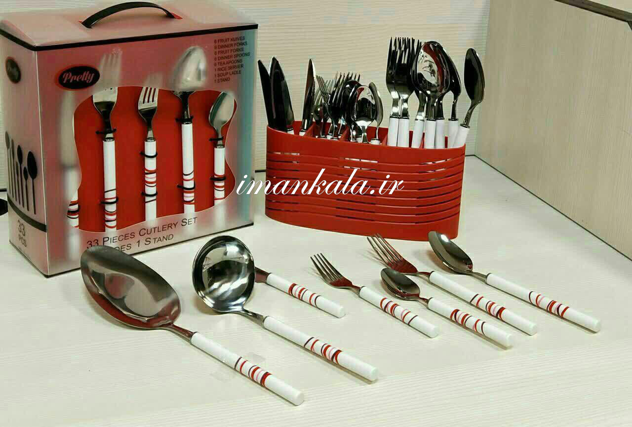 شامل 6 قاشق 6 چنگال 6 کارد میوه 6 چنگال میوه 6 قاشق مربا یک کفگیر یک ملاقه و یک پایه یا استند