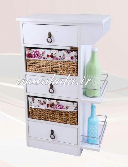 ۱۱۱۱۱۷ فایل دراور ۵ طبقه ۳ کشو چوبی ۲ سبد حصیری جای لوازم سیب زمینی پیاز ۲ طبقه کنار بطری دستمال حوله پارچه سفید گل سفید