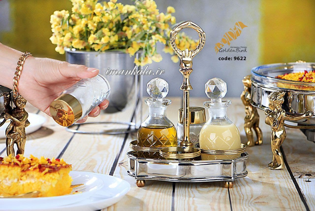 / golden bird 9622 مجموعه ست پذیرایی جای آبلیمو روغن نمک فلفل پاش برنجی